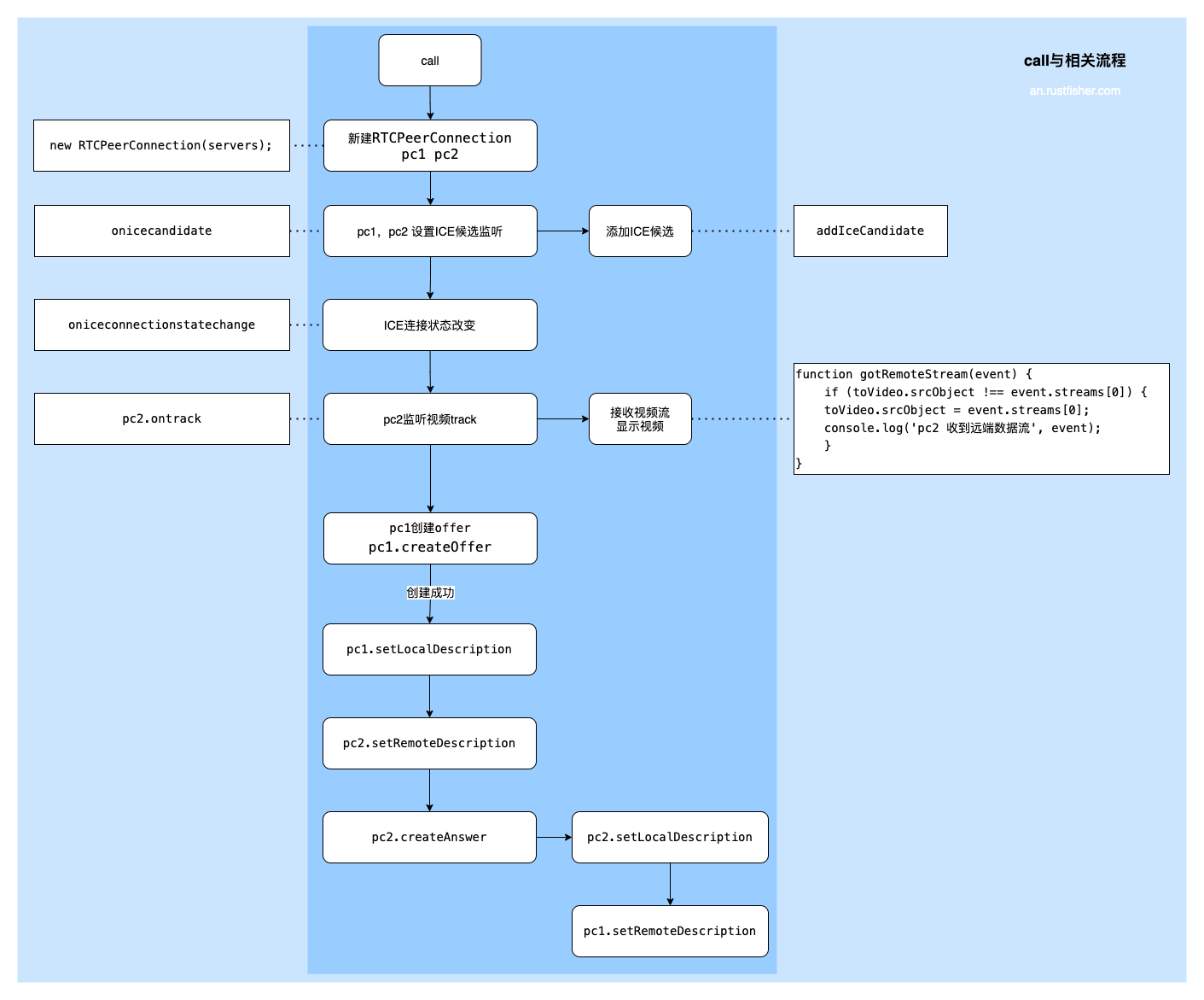 call()方法发起模拟传输的流程。新建节点后,设置ICE相关接听。监听ICE候选变化和连接状态变化。